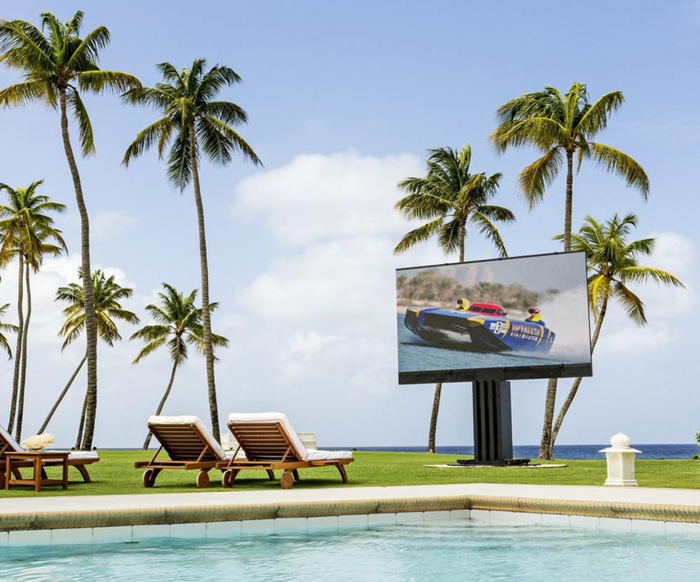 Version extérieure (outdoor) verticale de la TV géante C SEED. Découvrez le plaisir et l’élégance d’un écran géant dépliable au sein de votre villa (jardin, abord de piscine…)